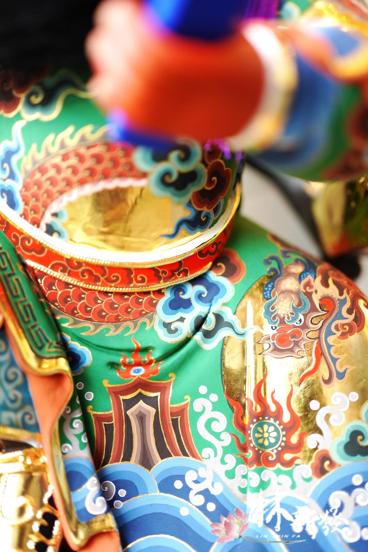這件帝君是早年台灣手手工打胚作品,結合了倫師新設計的南式青龍袍風格,